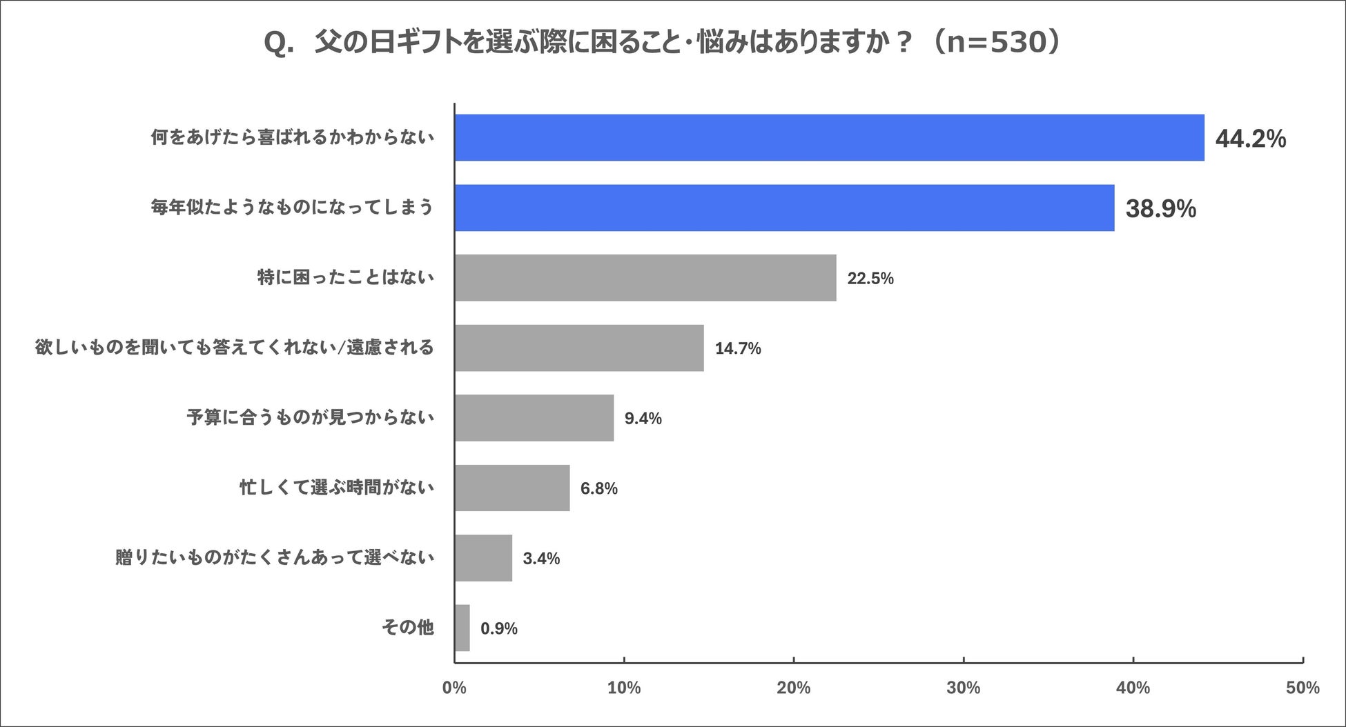 「父の日ギフトを選ぶ際に困ること・悩みはありますか?」という質問に対し、「何をあげたら喜ばれるか分からない」が44.2%、次いで「毎年似たようなものになってしまう」 が38.9%という結果となり、多くの人が”贈る気持ちはあるものの、選ぶのに困ってしまう”状況にあることが明らかになりました。