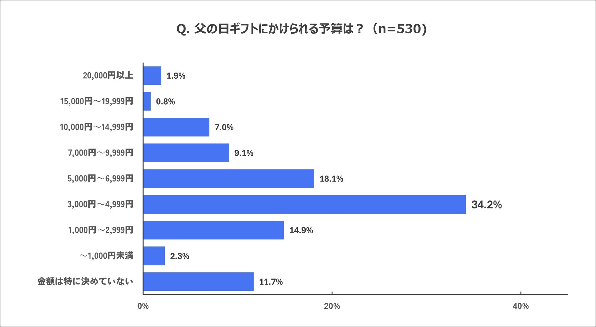 「父の日ギフトにかけられる予算は?」という質問に対し、最も多かった回答は「3,000円~4,999円(34.2%)」、次いで「5,000円~6,999円(18.1%)」や「1,000円~2,999円(14.9%)」という結果となりました。
