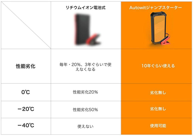 今までのジャンプスターターは気温が0℃以下では使えない、自体を充電しておく必要がある、高温の車内に放置すると発火する危険性があるなど、いくつの欠点がありました。
