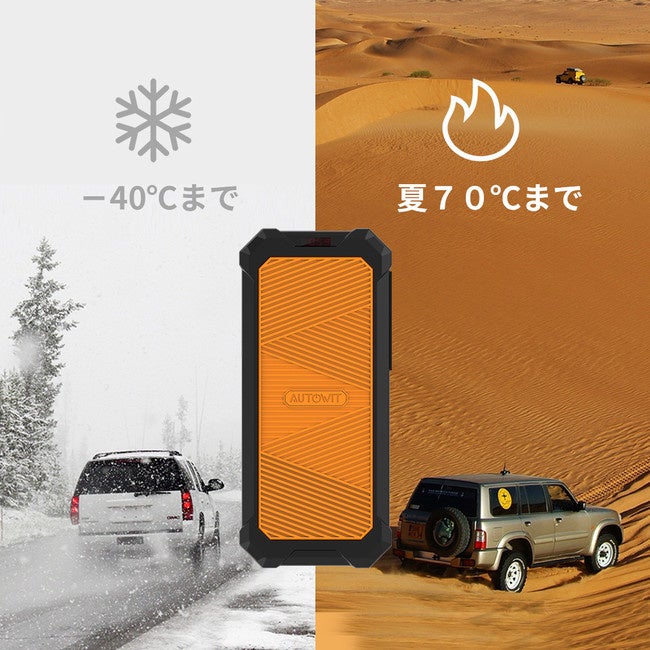 リチウムイオン電池を使用していないので、夏のドライブや冬のスキー旅行といった極端な温度の環境下でも使用できます(使用可能な環境温度:-40℃~70℃)。