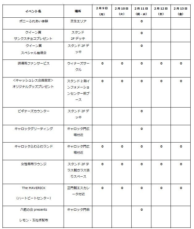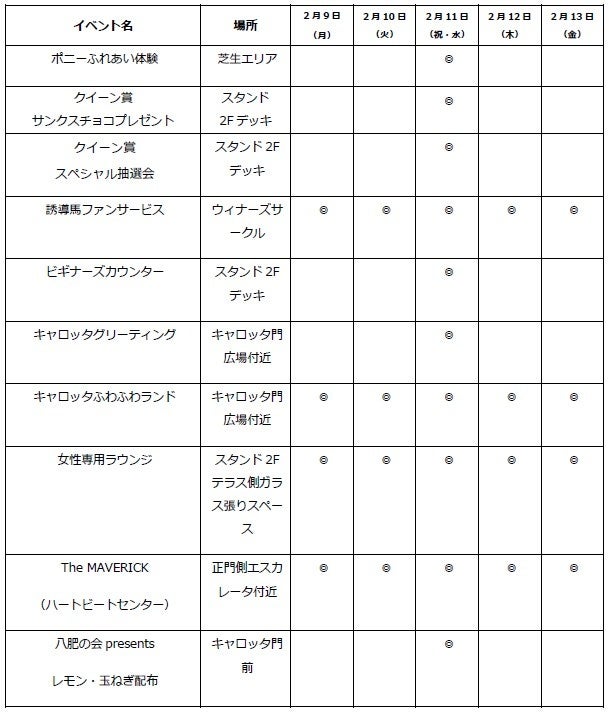 また、開催期間中は、「クイーン賞 スペシャル抽選会」、「クイーン賞 サンクスチョコプレゼント」などのスペシャルイベントに加え、キャロッタふわふわランドやビギナーズカウンターなど競馬ビギナーの方からお子様までご家族でお楽しみいただけるイベントを多数実施いたします。