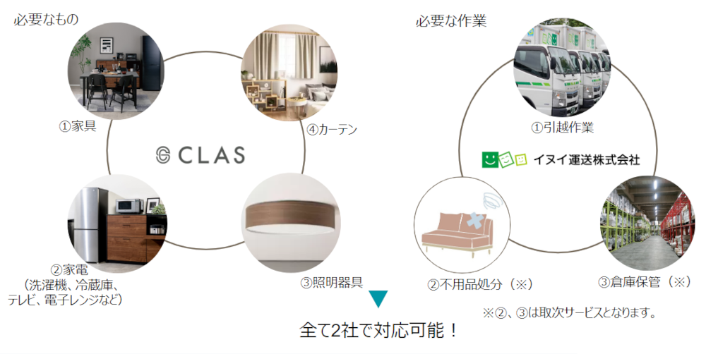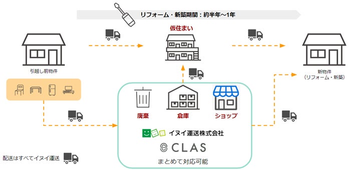 持たない、捨てない社会をつくる株式会社クラス(本社:東京都目黒区、代表取締役社長:久保 裕丈、以下「CLAS」)は、三菱地所ホーム株式会社(本社:東京都新宿区、代表取締役社長:細谷 惣一郎、以下「三菱地所ホーム」)、イヌイ運送株式会社(本社:東京都江東区、代表取締役社長:乾 隆志、以下「イヌイ運送」)と3業種提携し、三菱地所ホームにおいて住宅の新築またはリフォームの契約をしたお客さまが新居に引っ越すまでをワンストップでサポートする、「仮住まいサブスクパッケージ」の提供を2023年6月1日より開始いたします。