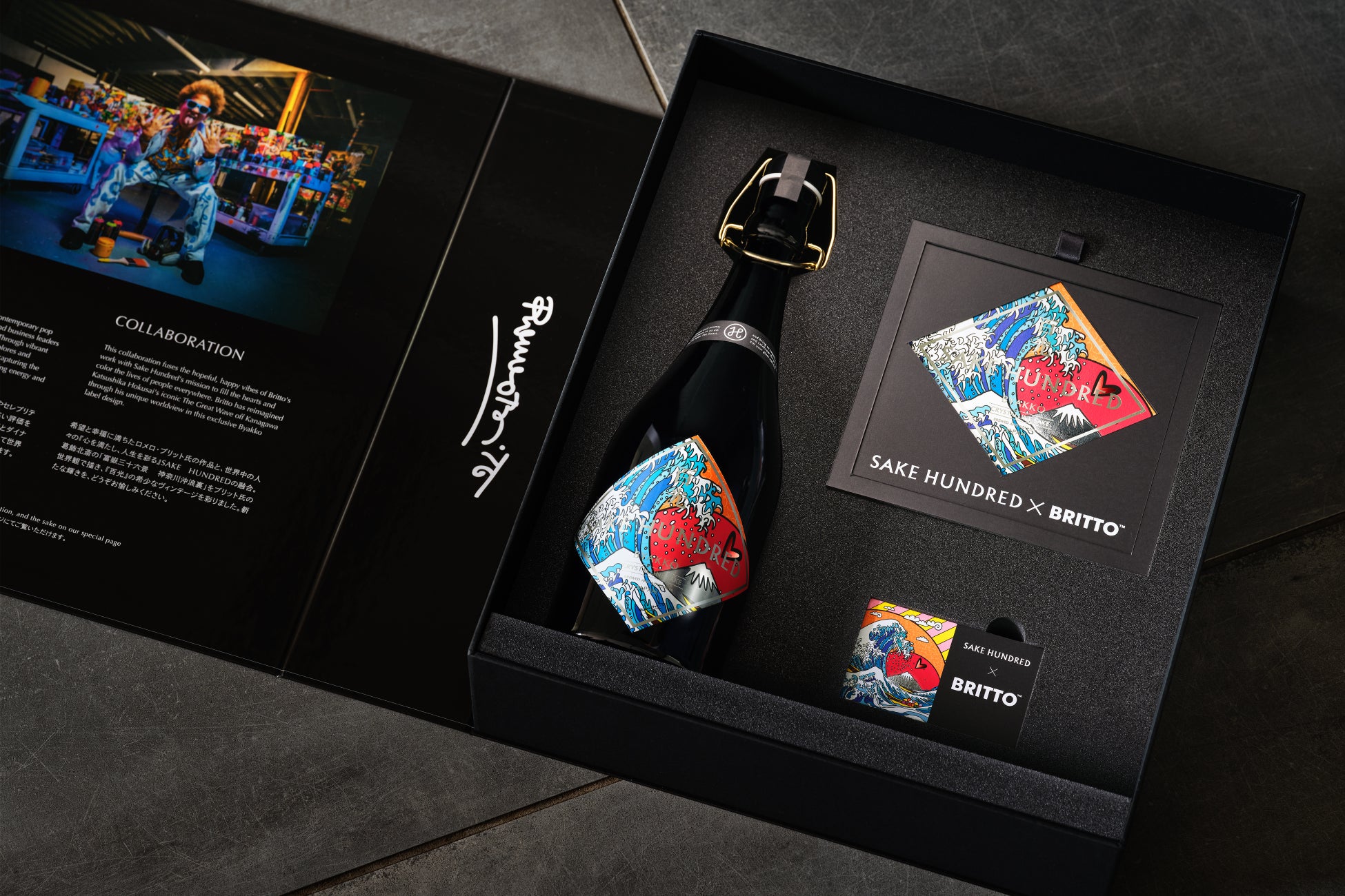 SAKE HUNDREDでは日本酒を通じて、日本文化の奥行きと美しさを世界へ伝えることを、一貫して大切にしています。「富嶽三十六景 神奈川沖浪裏」は、日本を象徴する富士山を題材にした、世界で最も知られる日本美術のひとつです。常に新たなスタイルを追求し続けた葛飾北斎と、ポジティブなエネルギーで人々の心を照らし続けるロメロ・ブリット氏。この二人によるアートと日本酒、異なる表現手法が交わることで生まれる“文化の共鳴”が世界に響きわたるように、この作品をコラボレーションアイテムに選びました。