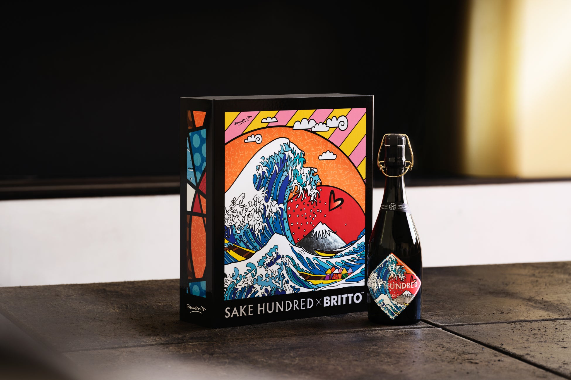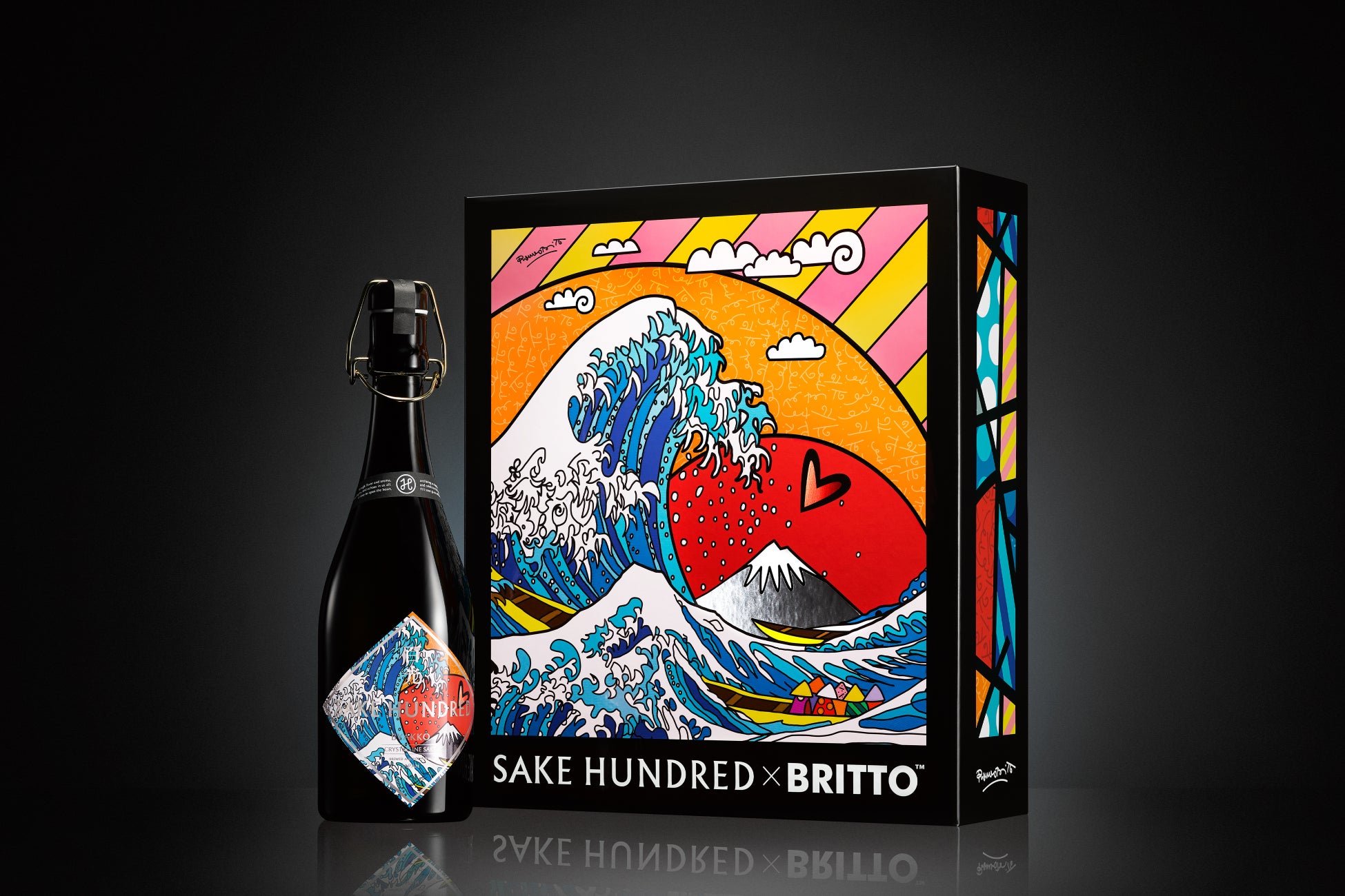 日本酒ブランド「SAKE HUNDRED(サケハンドレッド)」(運営:株式会社Clear/東京都渋谷区 代表取締役CEO:生駒龍史)は、世界的ポップアーティストであるロメロ・ブリット(Romero Britto)氏とのコラボレーションアイテムを1本100万円、100本限定で2025年11月5日(水)から発売します。葛飾北斎の代表的な木版画「富嶽三十六景 神奈川沖浪裏」に着想を得て制作されたアートワークを纏い、SAKE HUNDRED初のフラッグシップのヴィンテージ『百光(びゃっこう)』を販売します。