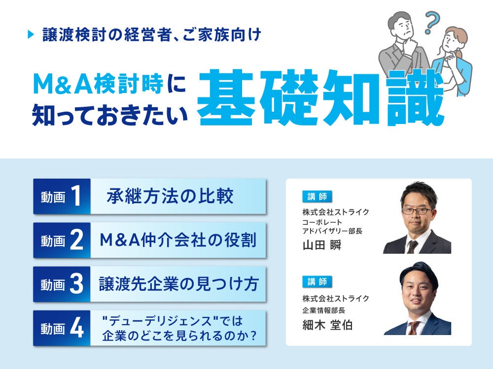 M&A 仲介の株式会社ストライク(本社:東京都千代田区、代表取締役社長:荒井邦彦、以下、当社)は、会社の譲渡を検討している経営者やご家族を対象とした解説動画『M&A検討時に知っておきたい基礎知識』を公開しましたのでお知らせいたします。