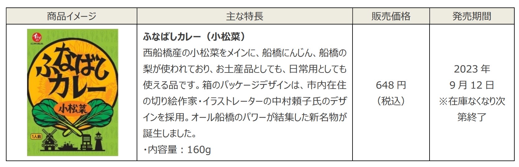 石井食品では、「地域と旬」という取り組みを進めております。地域食材に着目し、良質な食材を、その地域ならではの方法で調理し、 生産者のみなさまとともに商品開発をすすめ、その商品を通じて生産者や産地、食材の「ファン」を増やし、また、商品に対する消費者の声を直接生産者のみなさまにフィードバックすることで持続的に良質な食材 を作り、発展していける循環型のビジネスモデルを目指しております。その取り組みから誕生した『ふなばしカレー(小松菜)』は、2022 年の 9 月より商品開発をスタートし、2023 年 1 月に発売。発売から約2 か月で2,700 食を完売いたしました。西船橋産のブランド小松菜をメインに、船橋にんじん、船橋の梨を使った梨のピューレが使われており、お土産品としても、日常用としても使える品です。