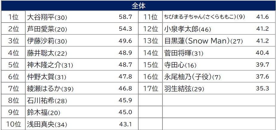 1位大谷翔平、2位芦田愛菜、3位伊藤沙莉でした。上位には、スポーツ・将棋・芸能の世界で活躍する日本の若者が並びます。ほぼ予想通りの結果となりました。