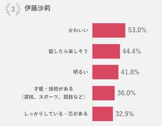 60代と70代以上で3位。孫にしたい理由1位は「かわいい」。2位「話したら楽しそう」、3位「明るい」、4位には「才能・技術がある」が入った。自由記述には、朝の連続ドラマ出演のコメントが寄せられた。演技力とキャラクターの魅力がランキングを押し上げた。