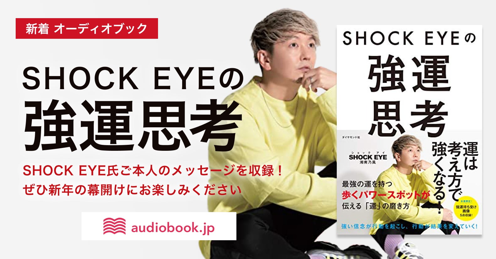 オーディオブック版『SHOCK EYEの強運思考』の特典として、SHOCK EYE氏ご本人からの生声メッセージを巻末にて収録します。「作品を聴き終えた方へのメッセージ」「2022年を良い年にするために大切だなと思っていること」などをお聴きいただけるので、ぜひ新年の幕開けにお楽しみください。