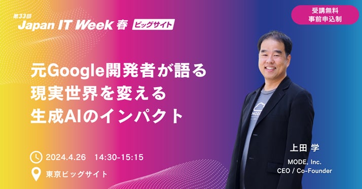 生成AIとIoTのチカラであらゆる“現場”のDXを進めるソリューションを提供するMODE, Inc.(本社:米国カリフォルニア州サンマテオ、CEO:上田 学、以下、MODE)は、4月24日(水)~26日(金)に開催されるJapan IT Week【春】会場にて実施されるセミナーに登壇いたします。
