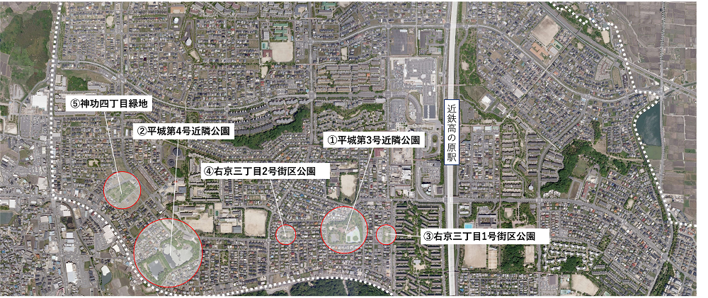 今回は、2022年にまちびらき50周年を迎える近鉄高の原駅を中心とした平城・相楽ニュータウン内の5つの公園をモデルとして選定し、公園利活用を促進させることで、これからの50年のまちづくりを公園から発信していくことを目指します。
