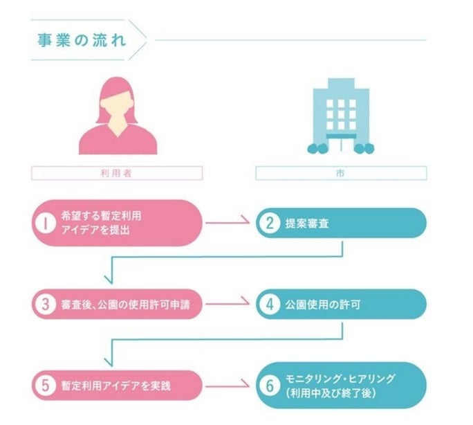 公共空間のさらなる魅力の向上や活性化を図るとともに、効果的な利活用の方法を探るため、暫定利用を希望する皆様の提案を募集し、一定期間、実際に使用してもらう制度です。