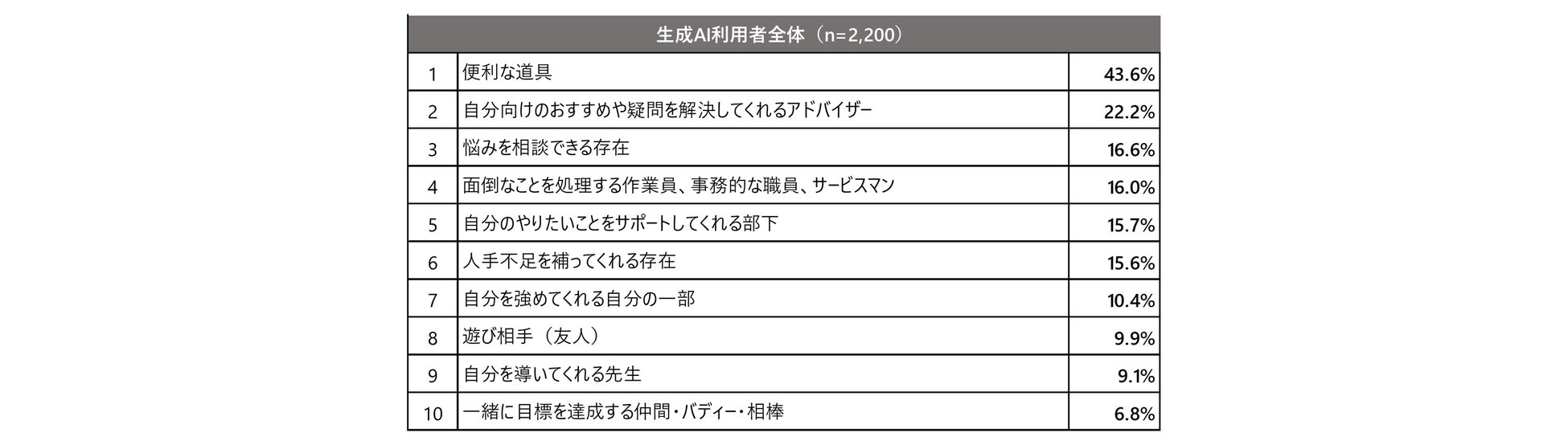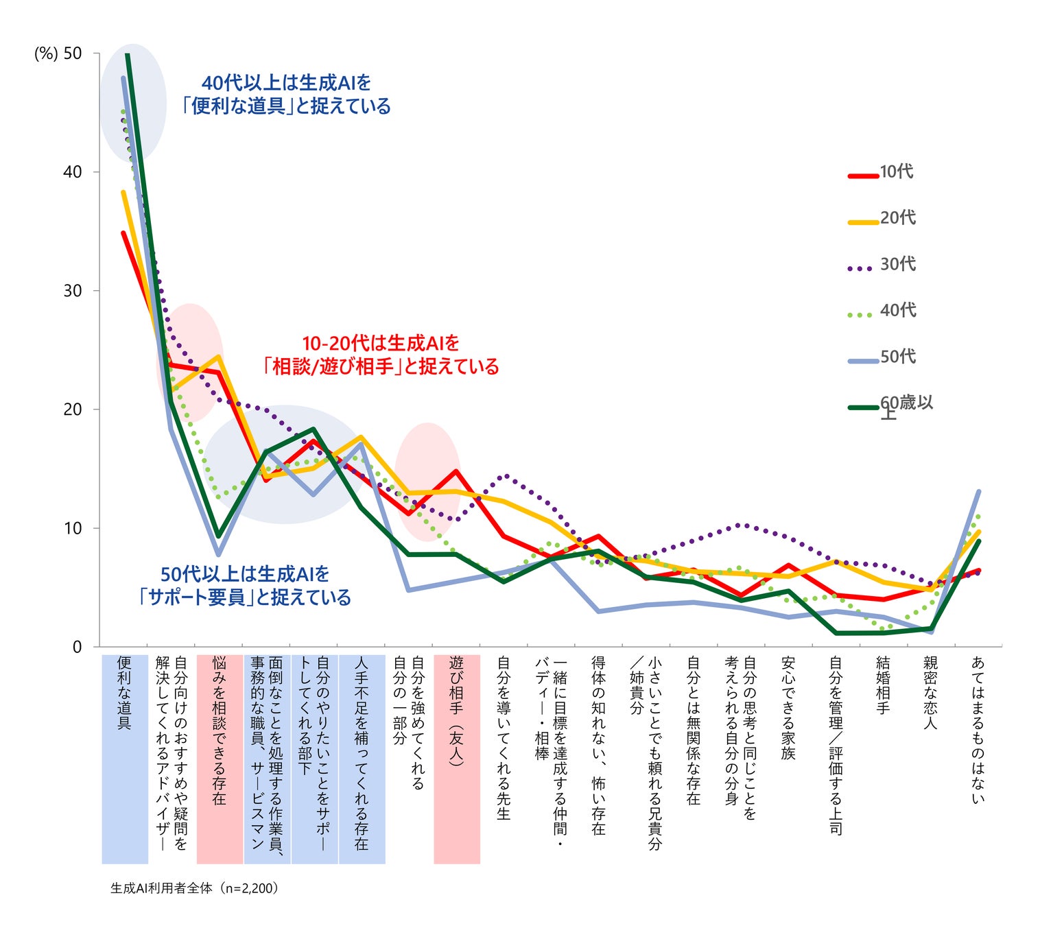 生成AI関連サービス利用者全体に、生成AIはどのような存在か聞いたところ、43.6%が「便利な道具」と回答。年代別に区切ってみると10代は生成AIを「便利な道具」と捉えつつも、「悩みを相談できる存在」や「遊び相手」としても捉えていることがわかった。50代以上は、生成AIをあくまでも「便利な道具」「サポート要員」として捉えており、情緒的なつながりを求める傾向は低い。