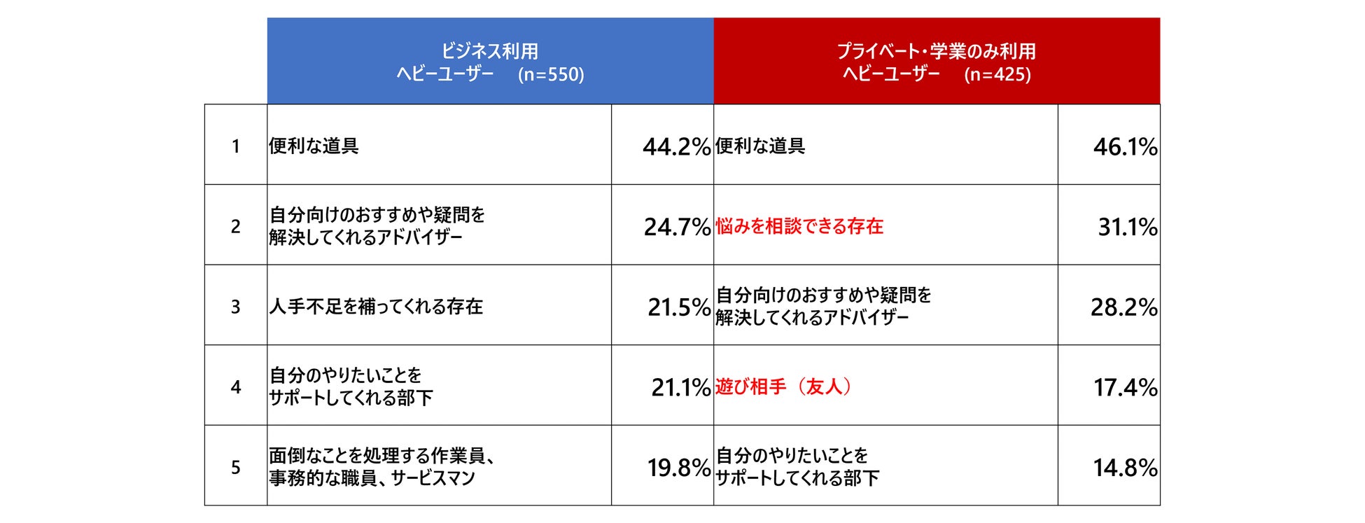 ヘビーユーザーに生成AIはどのような存在か聞いたところ、プライベート・学業利用ヘビーユーザーは生成AIを「悩みを相談できる存在」や「遊び相手」として、捉えているのに対し、ビジネス利用ヘビーユーザーは仕事をサポートする存在として捉える傾向があった。