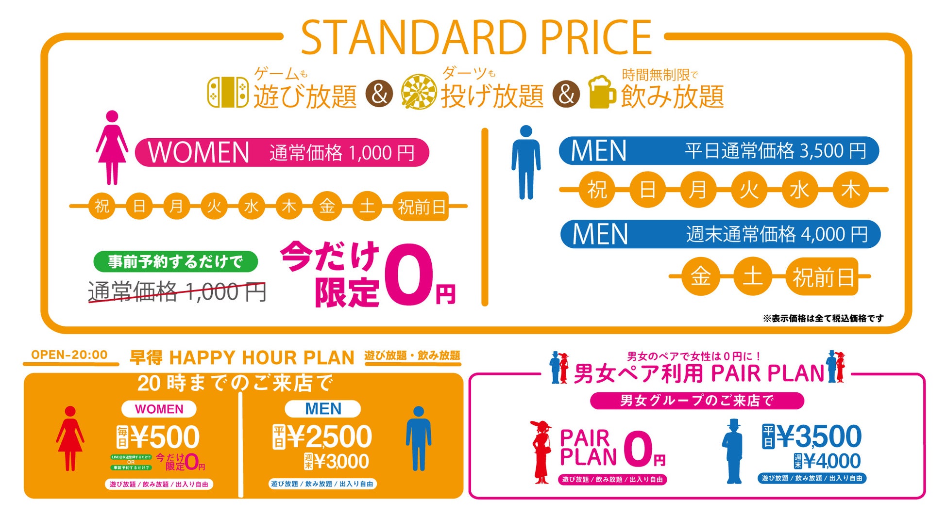 エントランスフリーで、ダーツやゲームもフリーでご利用いただけます。ドリンクは有料で、飲み放題かワンドリンクをお選びいただけます。