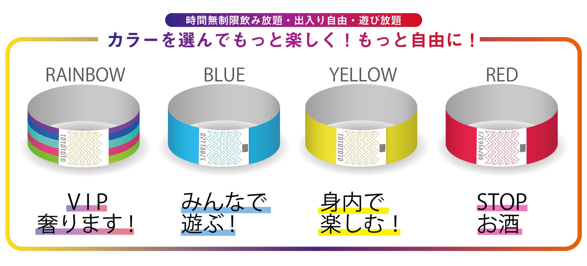 時間無制限飲み放題プランをご注文いただいた方はその日の気分や交流範囲を示す4色のリストバンドを身につけてお楽しみいただきます。