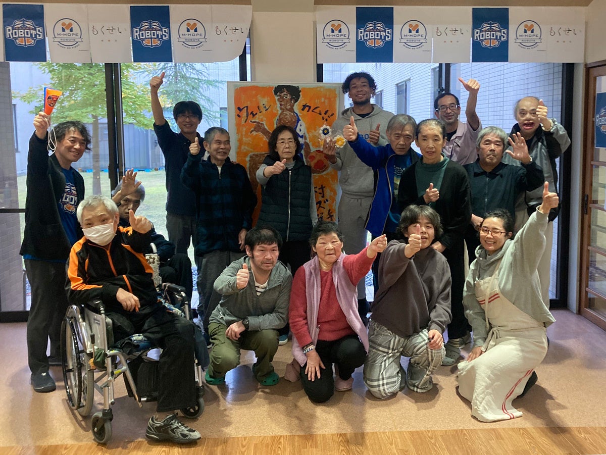 救護施設では、施設内のクラブ活動やイベント活動もあるようです。千波湖まで歩いたり、イラストを描くクラブ活動があったりします。今回のようなロボッツコラボのイベントや試合招待など、入居者の方にとって日常の中の楽しみになるようにこれからも関わっていきたいと思いました。