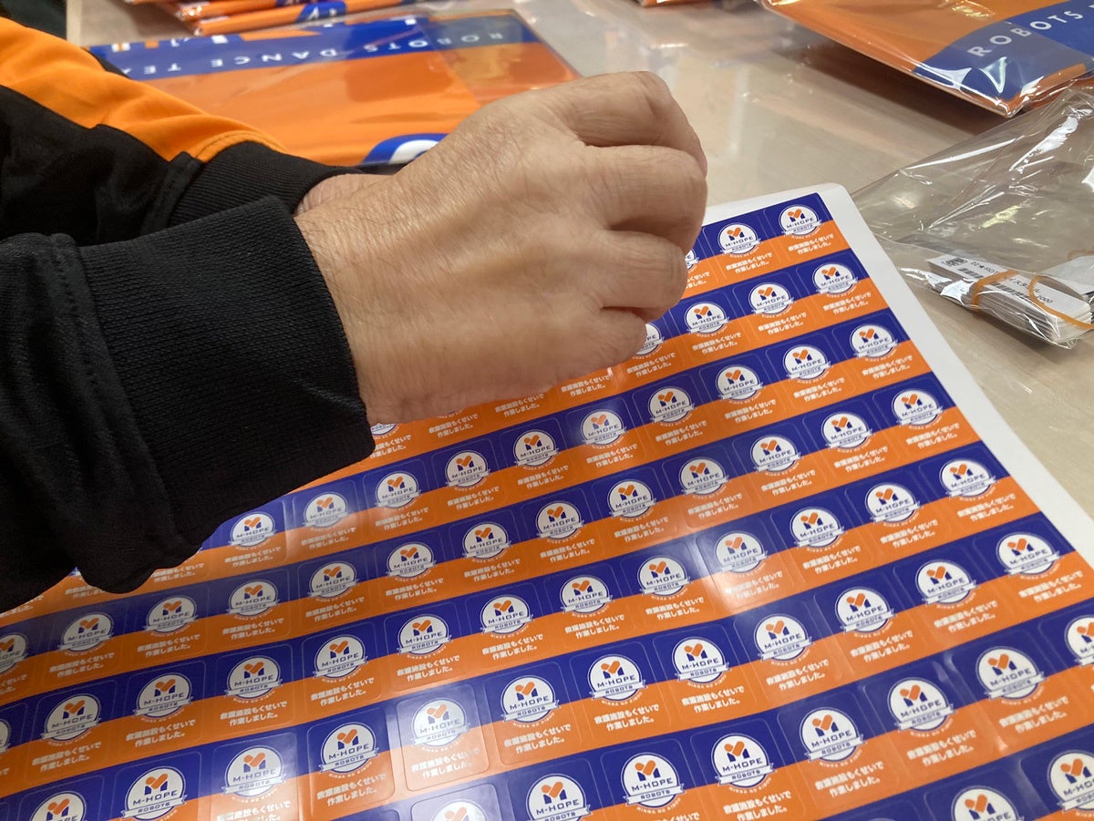 ただ、その一つ一つが施設の方々の手によって作業され、グッズを買ってくださる方に喜んでもらえるよう心を込めて貼られたものです。何度も何度も貼り直してみたり、うまく剝がれないシールを入居者の皆さま同士、できることで協力しながら貼っていたりしました。時にはスタッフがお手伝いしながら、入居者の方が率先して進めてくださっています。M-HOPEシールはその温かさの証です。このシールを見かけたら、ぜひ商品を手に取ってその温もりを感じてみてください。