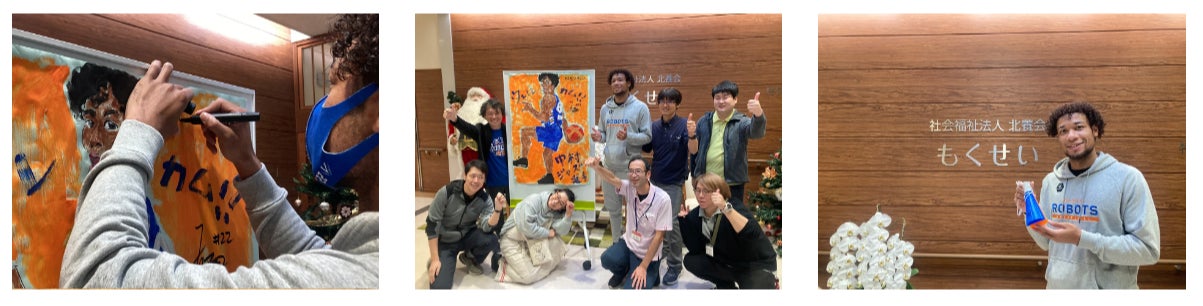 今回救護施設もくせいさんを訪問して、もくせいの皆様には本当に温かく迎えていただきました。手作りの大きなイラストを描いてくれたり、大ホールにはロボッツの装飾をしてくれました。本当に嬉しかったです。