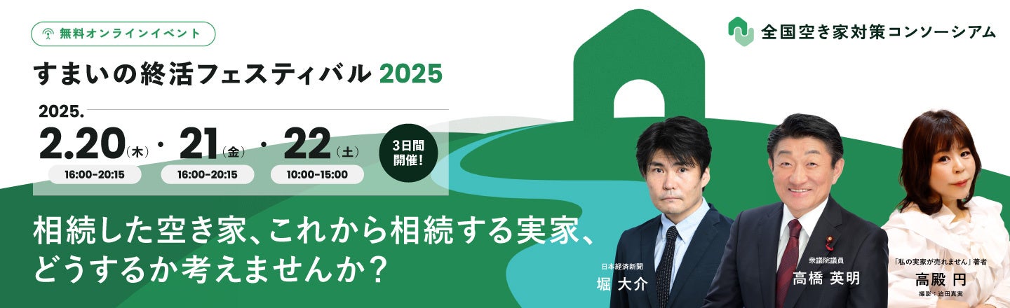 2025年2月20日(木)~22日(土)に、オンラインイベント「すまいの終活フェスティバル2025」を開催します。空き家にお悩みの方、これから実家を相続する予定の方に向けて、様々なご意見番をお招きして、空き家問題の解決策について一緒に考えるオンラインイベントです。イベント申し込み者を対象に、ゲスト登壇する作家 高殿円 氏の著書「私の実家が売れません!」のプレゼント企画も実施します。