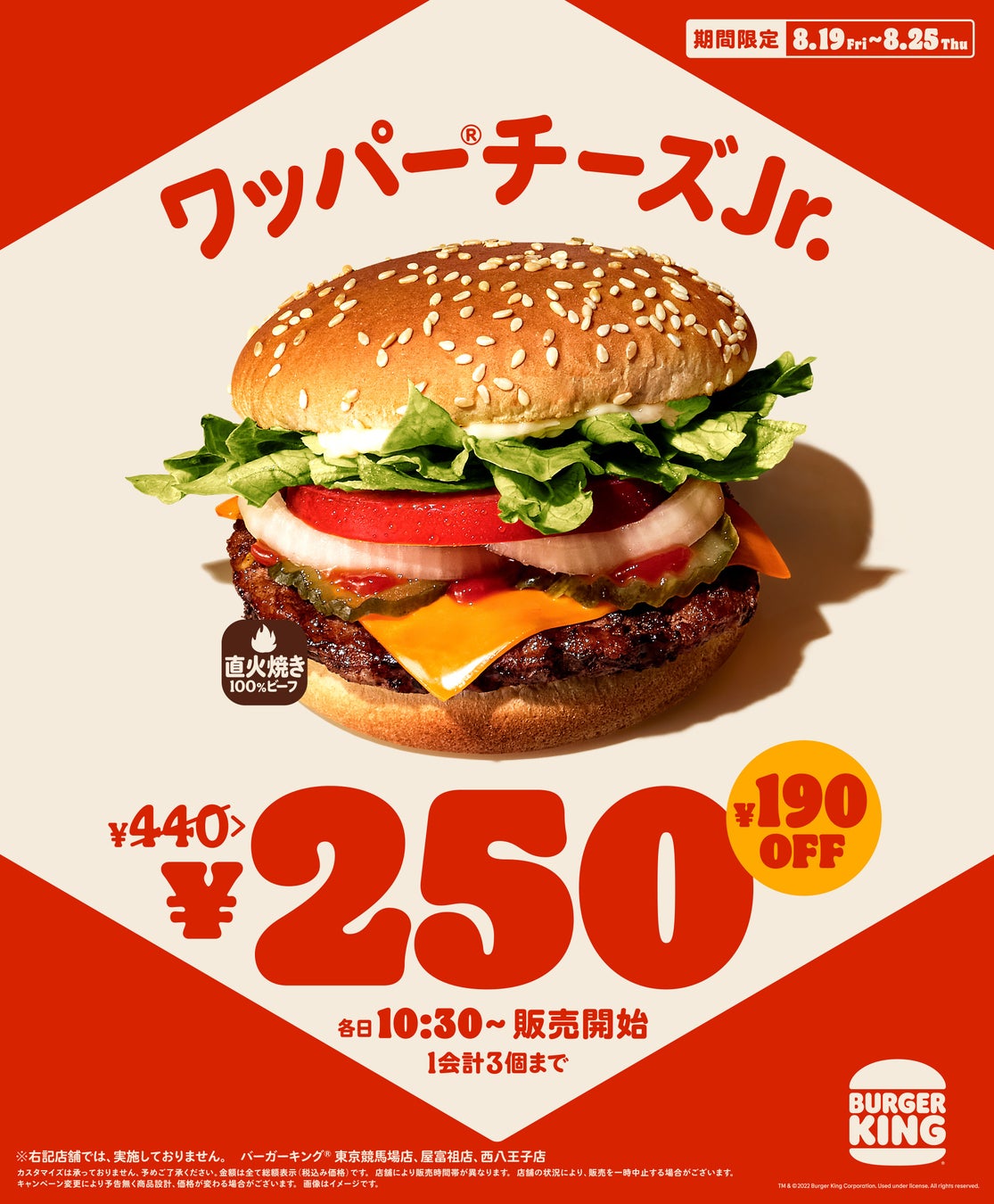 株式会社ビーケージャパンホールディングス(本社:東京都千代田区)は、2022年8月19日(金)~8月25日(木)の1週間限定で、各日10時30分から『ワッパー® チーズJr.』を通常価格440円のところ、43%オフ190円引きの特別価格250円で販売いたします。