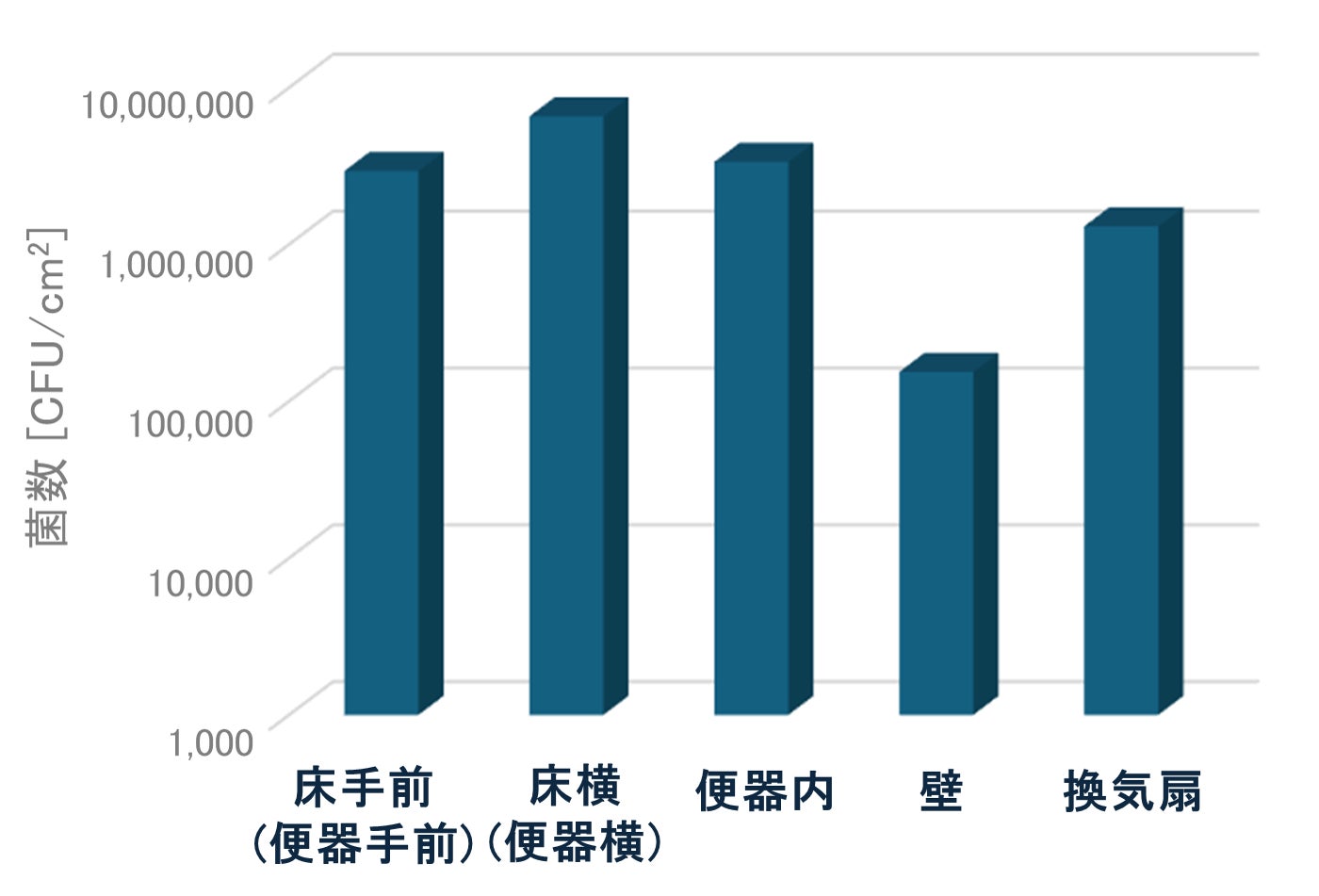 試験条件:家庭のトイレの各場所において菌を採取し、生菌数を測定。