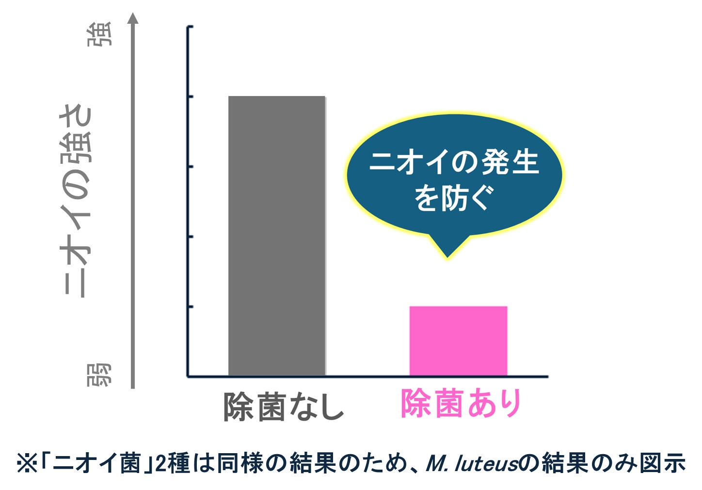 そこで、これらの「ニオイ菌」の除菌による効果を評価したところ、除菌剤で除菌することで汚れと混ざってもニオイの発生を防ぐことができ、掃除しても戻ってくるニオイの対策として有効であることを確認しました(図5)。
