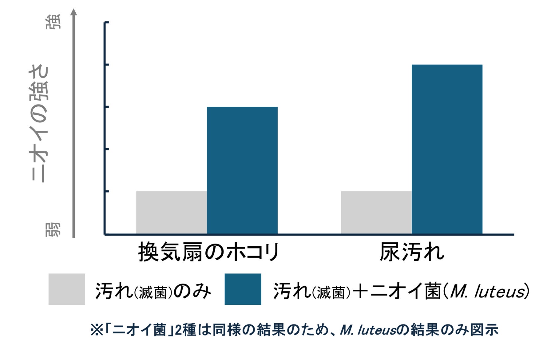 次に、ニオイの原因となる細菌の種類を調べました。当社の強みである菌叢解析技術を活用し、ニオイが気になるトイレの各場所における細菌を分析した結果、Micrococcus luteus (以下、M. luteus)とKocuria marina (以下、K. marina)という2種類の細菌が抽出されました。これらの菌は床から換気扇までトイレの様々な場所で検出され(図3)、換気扇のホコリや尿汚れと混ざることでニオイを増大させていることが明らかになりました(図4)。以上の結果から、掃除しても戻ってくるニオイの原因は、掃除しにくい場所にたまった汚れとトイレ全体に存在するこれらの「ニオイ菌」が関与すると結論づけました。
