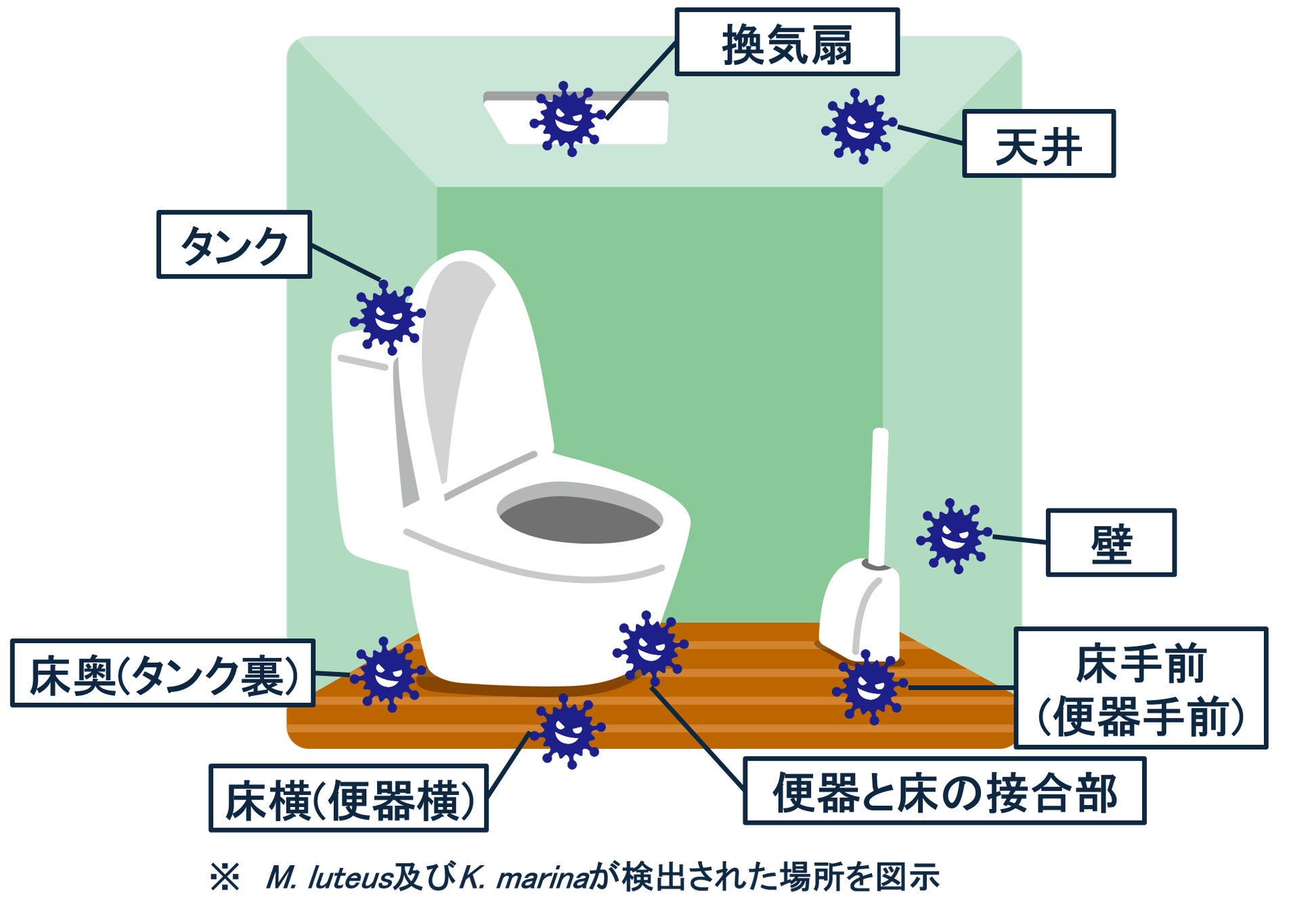 まず、家庭のトイレのどの場所に細菌が存在するのかを調査した結果、床から換気扇に至るまでトイレ全体に細菌が存在していることがわかりました (図2)。