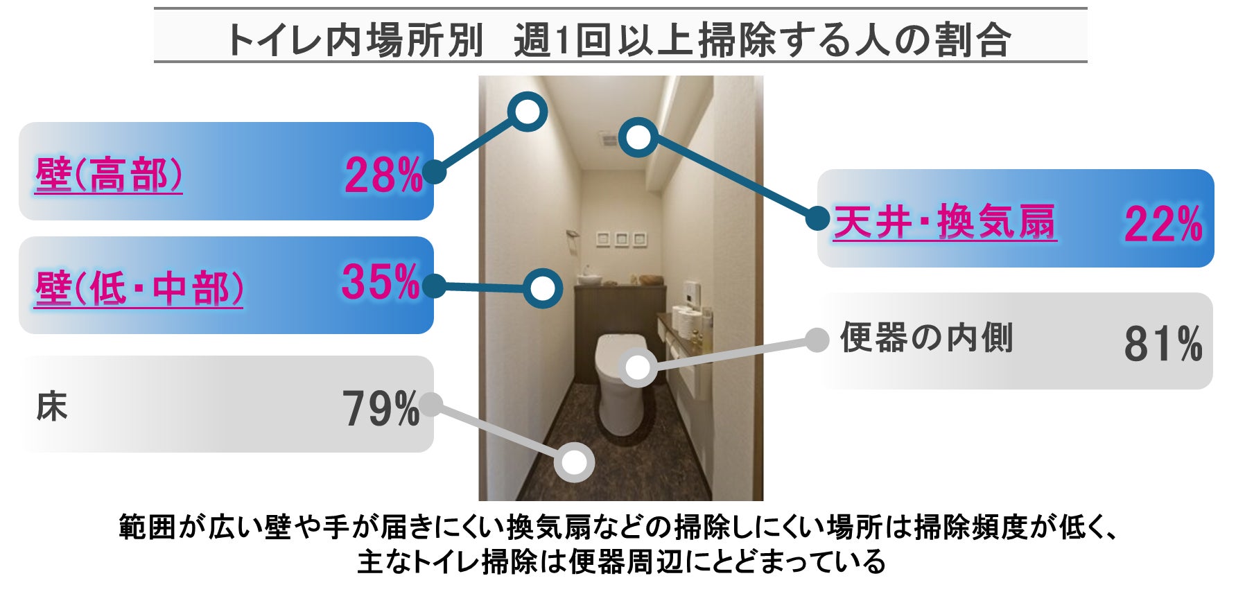トイレ掃除の実態を調査(※3)したところ、生活者の約8割は「掃除してもしばらくするとニオイが出てきて不満」と感じていることが明らかになりました。また、便器や床を週に1回以上掃除している人は8割にのぼる一方で、換気扇や壁などは2~3割と少なく、生活者のトイレ掃除が便器周辺にとどまっていることがわかりました(図1)。
