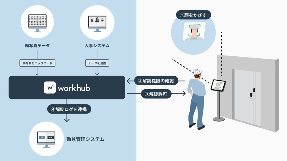 清水建設の保有する顔写真データと人事システムの情報、顔認証での解錠ログを「workhub」を通じて勤怠管理システムへ連携することで、入退室時の顔認証の時刻を自動的に勤怠表に反映します。