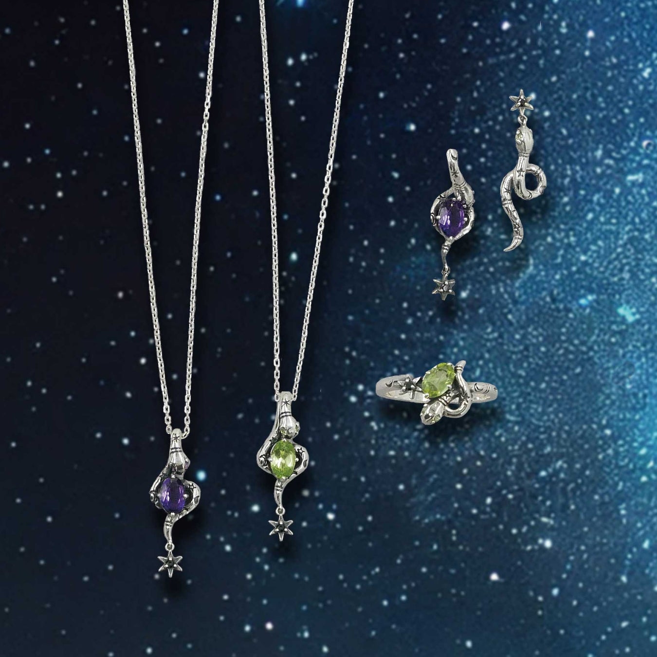 幸運を招くという言い伝えのあるヘビモチーフを、シルバーと天然石でANNA SUIらしく表現。