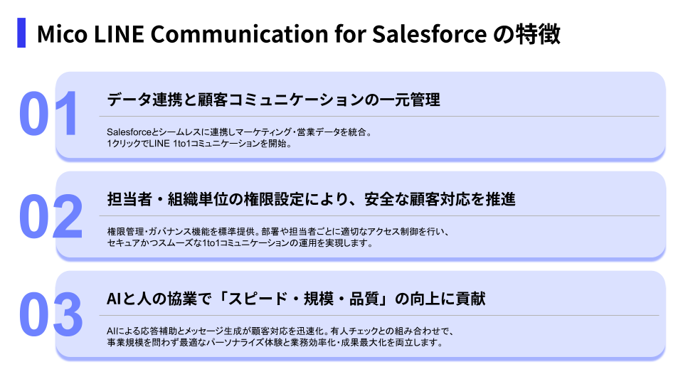 LINEコミュニケーションツール「Mico Engage AI」「BizClo」とSalesforceの顧客データと連携することで、顧客一人ひとりに合わせた最適なコミュニケーションを実現するプラットフォームです。Salesforceの顧客画面から1クリックでLINE 1to1コミュニケーションを開始できるなど、顧客情報に基づいたパーソナライズされた対応をスムーズに行えます。