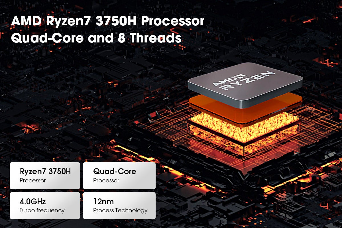 新LarkBox Xはプロセッサに前世代に搭載されていたAMD Ryzen™ 7 3700UよりTDPが15Wから20Wに増加したAMD Ryzen™ 7 3750Hを採用しました。デュアルチャンネルメモリはDDR4-2400に対応、CPUアーキテクチャはZen+を採用し、1クロック当たりの処理能力が3%向上しています。消費電力が同様の場合、より高いクロック数で動作可能です。