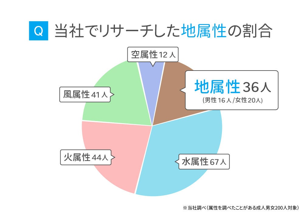 以前弊社が調査したアンケートでは成人男女200人のうち36人が地属性という結果が出ております。