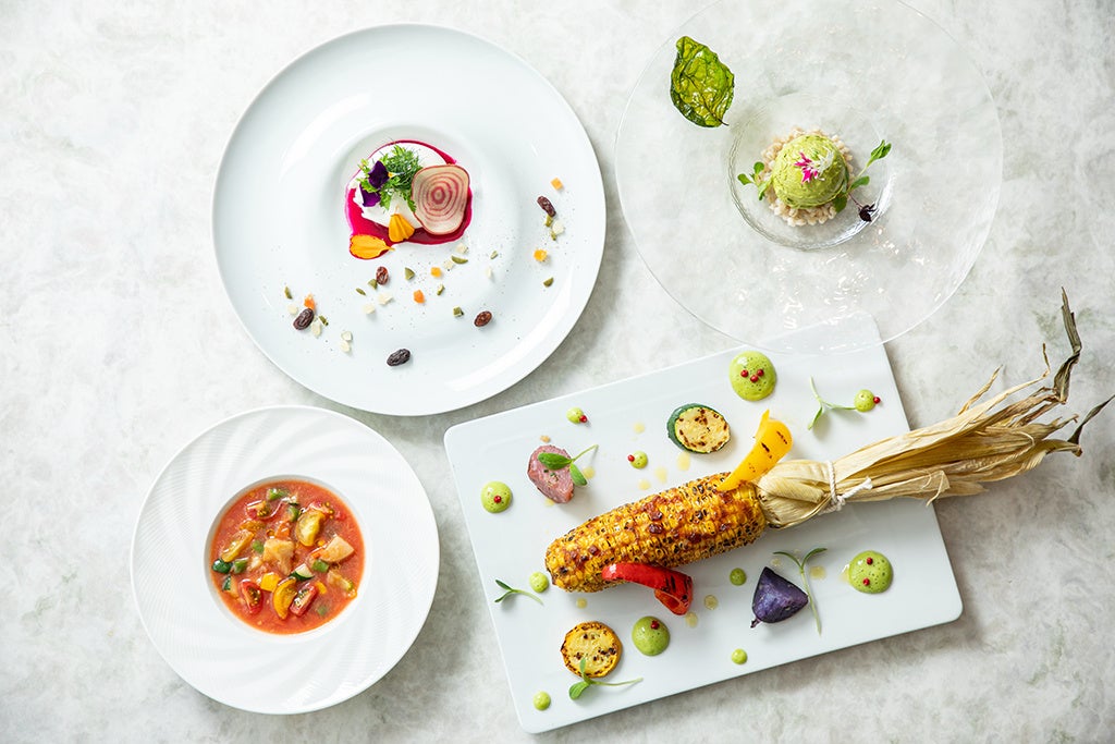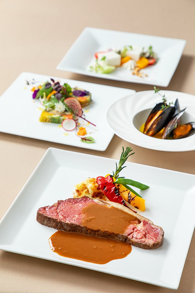 メニューには、野菜ソムリエである料理長・石川 篤志(いしかわ あつし)が東京野菜の魅力に惚れ込み考案した”東京野菜が主役のベジフルコース“を含むフレンチテイストのコース料理を3種類、そして赤身肉のおいしさが詰まった食べ応え抜群なホテルのシグネチャーメニュー”熊本県産あか牛の贅沢バーガー“のほかに、