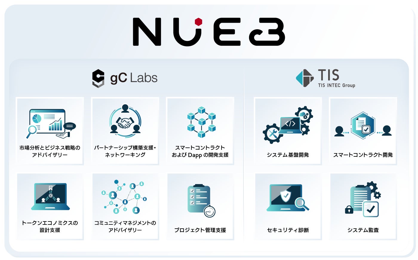 「NUE3」の提供にあたっては、gC Labsが市場分析やビジネス構築支援のアドバイザリー、トークンエコノミクスの設計支援、コミュニティマネジメントのアドバイザリーなどのコンサルティングを提供し、TISがweb3事業に必要なシステム基盤開発、スマートコントラクトの開発、セキュリティ診断などの開発支援全般を担います。
