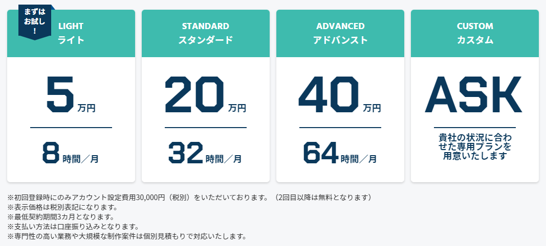月額定額制の5万(ライト)、20万(スタンダード)、40万(アドバンスト)/それ以上(カスタム)を用意。定期的なメンテナンスや自社サイトの記事入稿作業、広告代理店のアウトソース先、制作会社が手がけるクライアントサイトの公開前チェック、大手企業の毎月のサイト更新作業など、あらゆる制作ニーズにお応えします。