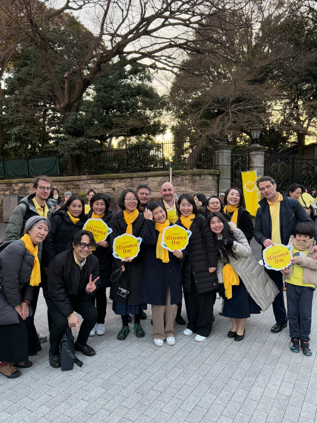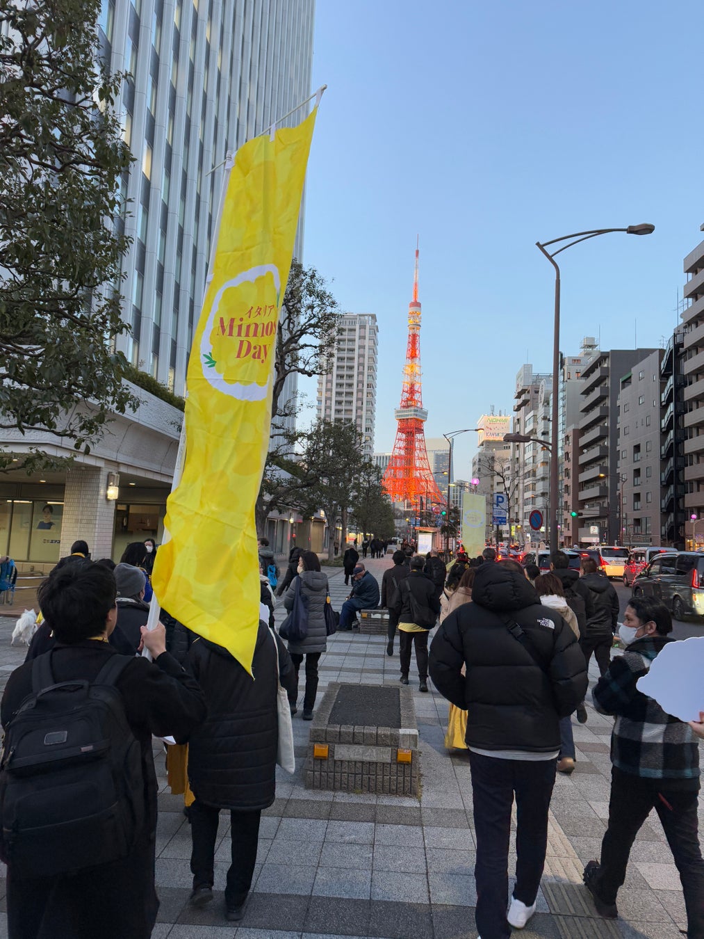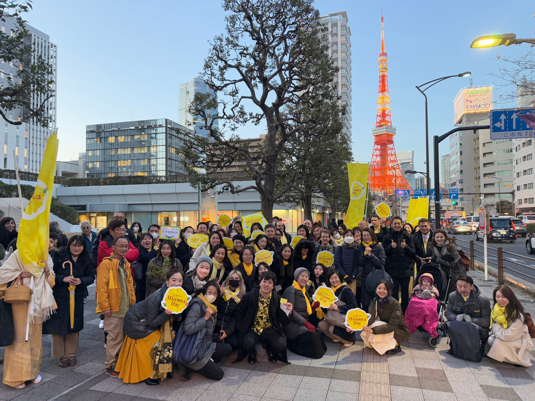 1950年代からイタリアでは3月8日に男性が女性へミモザの花束をプレゼントする風習があります。 そのすてきなイタリア文化習慣を日本に広めるために在日イタリア商工会議所は、2021年から「MIMOSA DAY」というイベント事業を展開しています。その「MIMOSA DAY」ミモザデーの活動の一環として、幸せを運ぶ黄色のものを着用して、東京の街を象徴的に歩く~THE YELLOW WALK~。今年は、駐日イタリア大使館から東京タワーまで、みんな一丸となって歩きました。