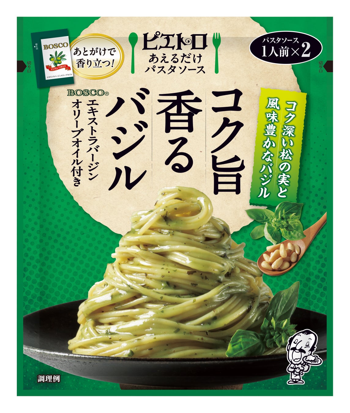 から、「コク旨香るバジル」を発売いたします。パスタソース1人前が2袋入りのため、一人暮らしの方や忙しくて時間がない方でも、手軽に“あえるだけ”で本格的な一品をお楽しみいただけます。