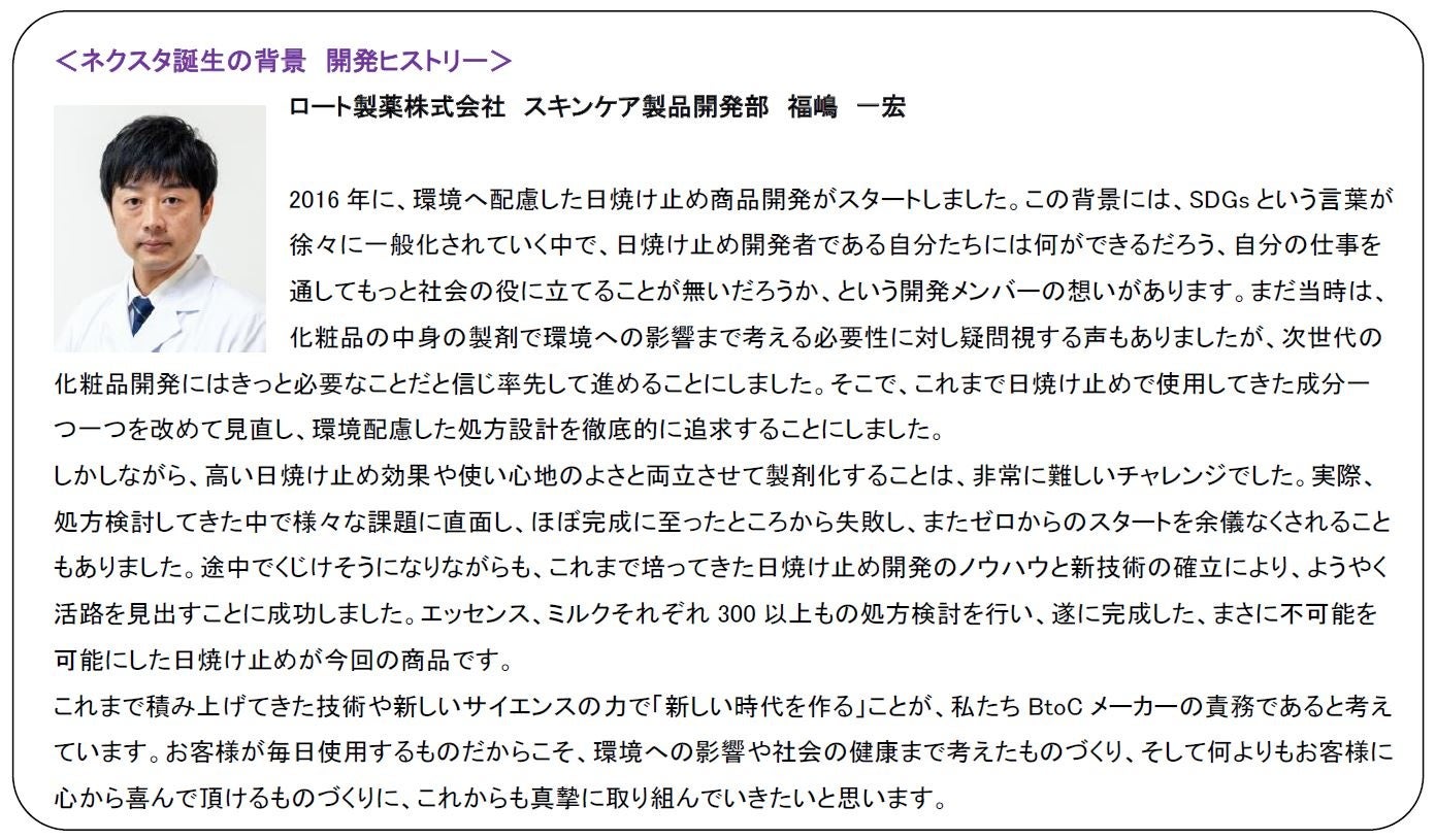 その結果、環境に配慮した処方設計でありながら、同時に高い日焼け止め効果と使い心地の良さを徹底追究し、毎日気持ちよく使えるスキンケアUVブランドである「スキンアクア」から、オトナ肌のための美容液から生まれた日焼け止め、「スキンアクア ネクスタ」シリーズの誕生に至りました。