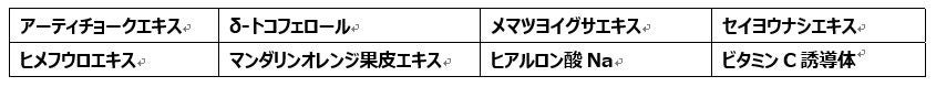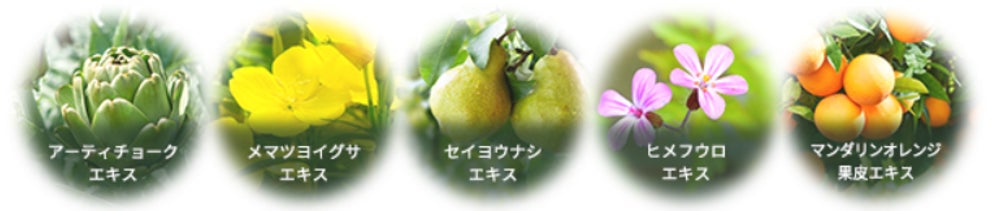 保湿成分として、アーティチョークエキス※5、δ-トコフェロール※6、メマツヨイグサエキス※7、セイヨウナシエキス※8、ヒメフウロエキス、マンダリンオレンジ果皮エキス、ヒアルロン酸Na、ビタミンC誘導体※9 を配合しています。