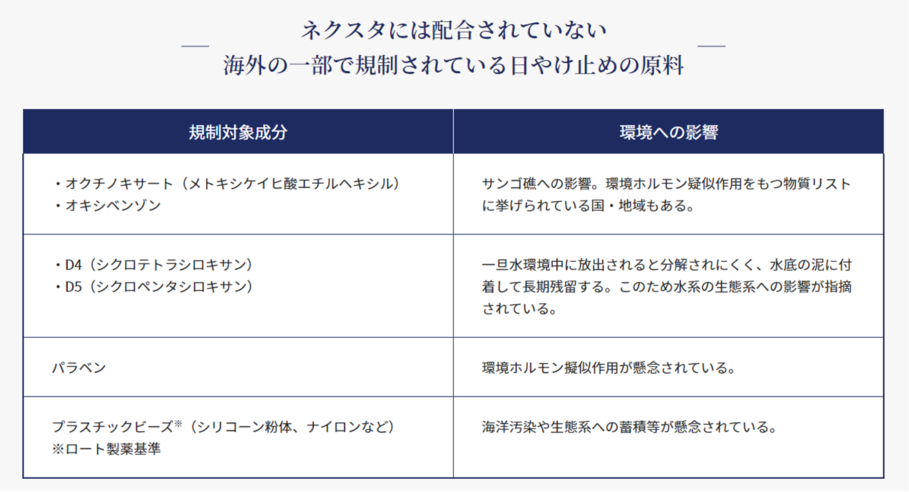 日焼け止め商品の多くに配合されており、海外の一部で規制のある紫外線吸収剤をはじめとする成分を抜くことに成功。製剤技術を駆使し、高い日焼け止め効果および使い心地のよさなどお客様のユーザビリティを追究すると共に、毎日使う日焼け止め商品が環境への影響を配慮し続けられる仕組みを設計しました。