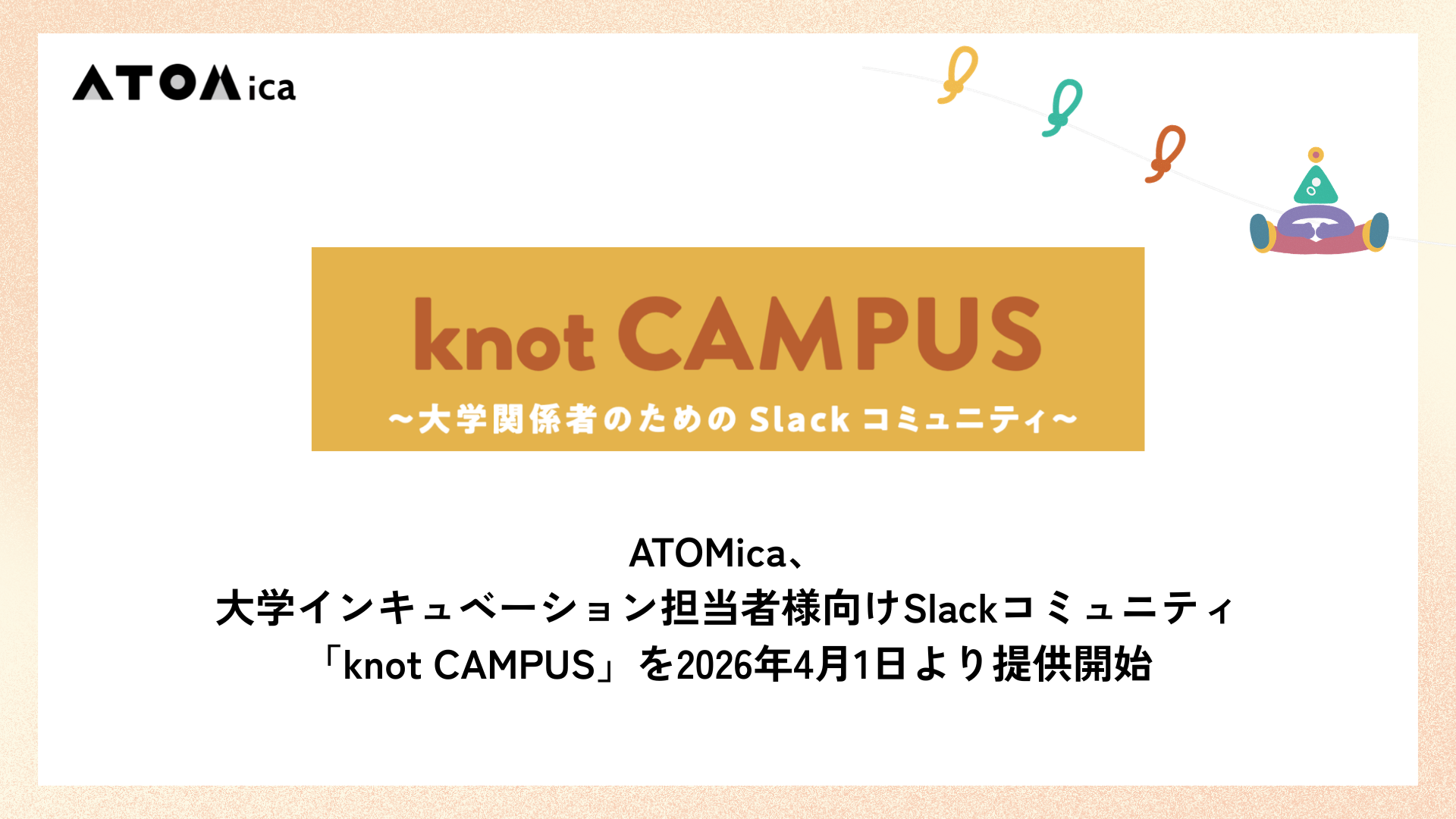 株式会社ATOMica(本社:宮崎県宮崎市、代表取締役Co-CEO:嶋田 瑞生、南原 一輝、以下「ATOMica」)は、全国のインキュベーションに関わる大学関係者を対象としたSlackコミュニティ「knot CAMPUS(ノットキャンパス)」を2026年4月1日(水)より提供開始いたします。