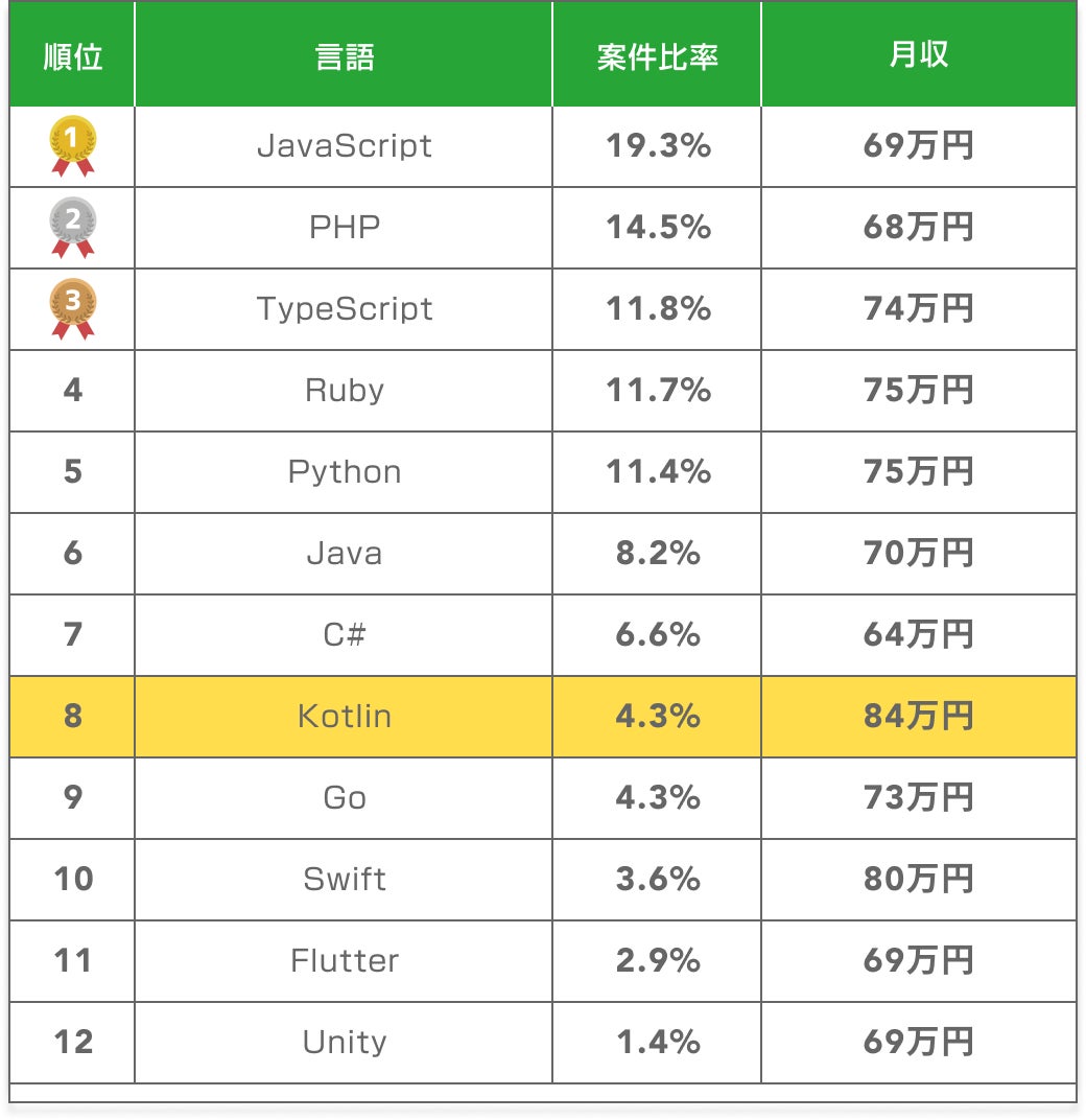 Kotlinの案件は全体の4.3%を占めており、プログラミング言語案件数ランキングでは8位に位置しています。Kotlinエンジニアは比率としては比較的小さいものの、案件数が限られている分、専門性の高さから高い年収に繋がっていると考えられます。