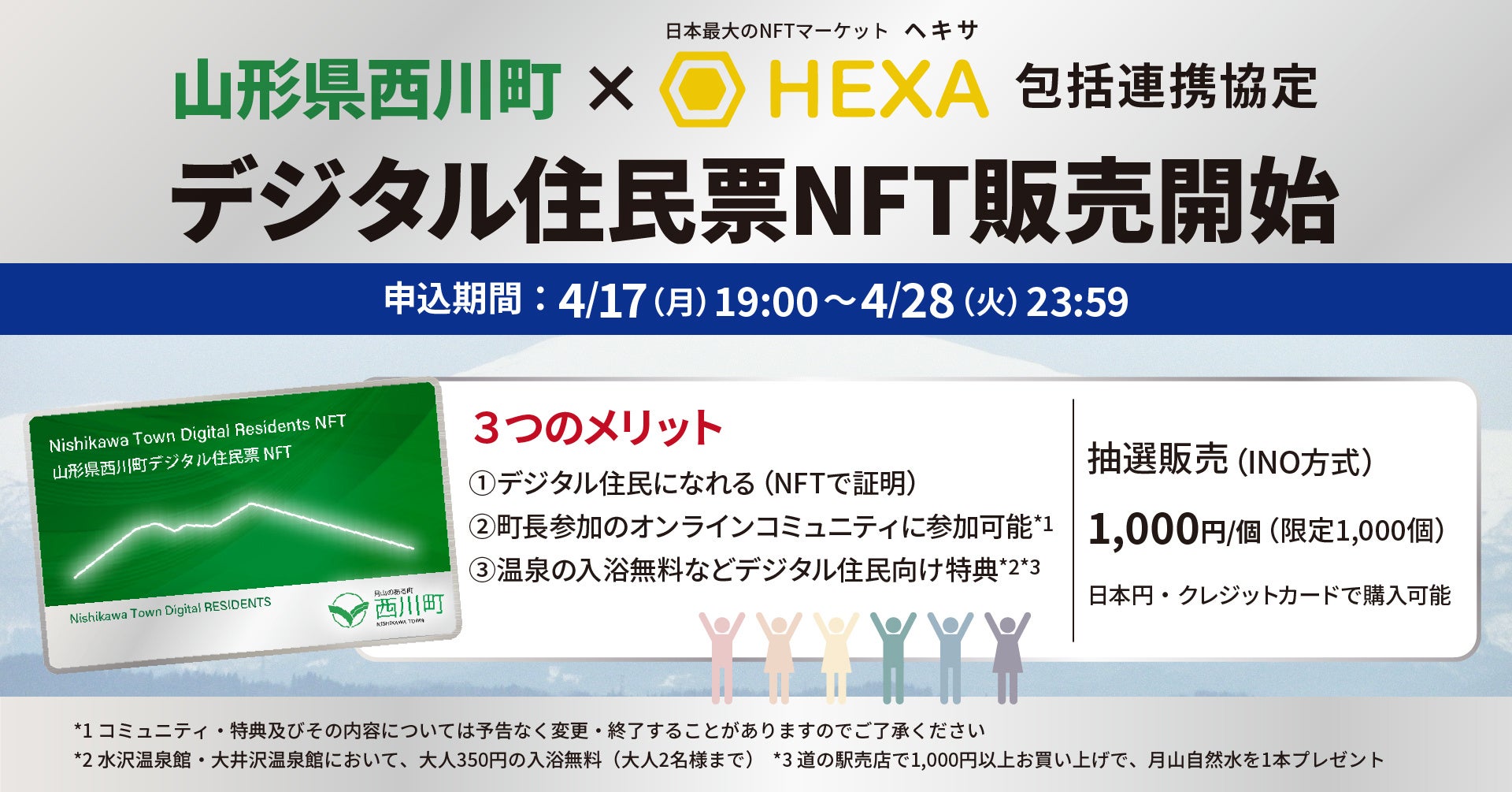 日本最大級のNFTマーケット「HEXA(ヘキサ)」は山形県西川町と包括連携協定を締結し、関係住民創出に向けて西川町デジタル住民票NFTを1個1,000円で1,000個販売します。