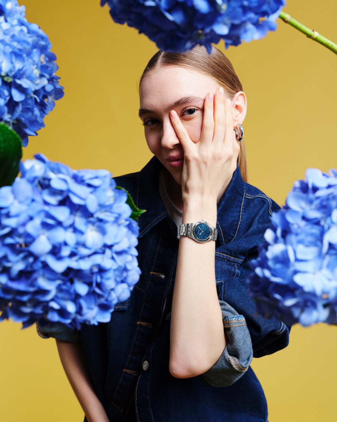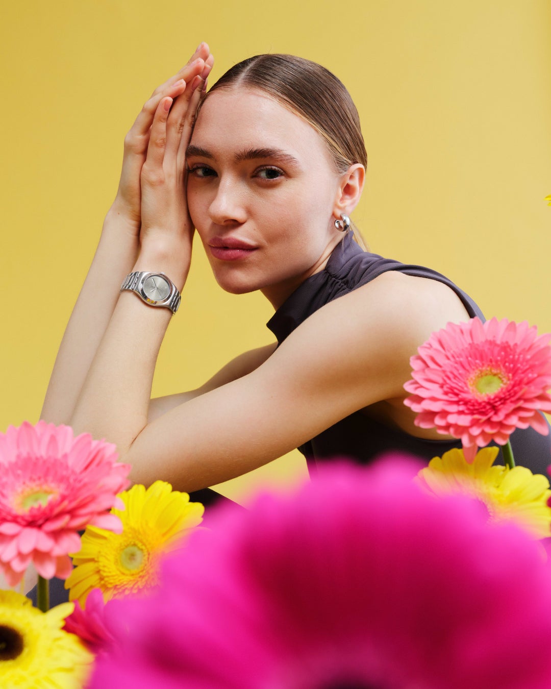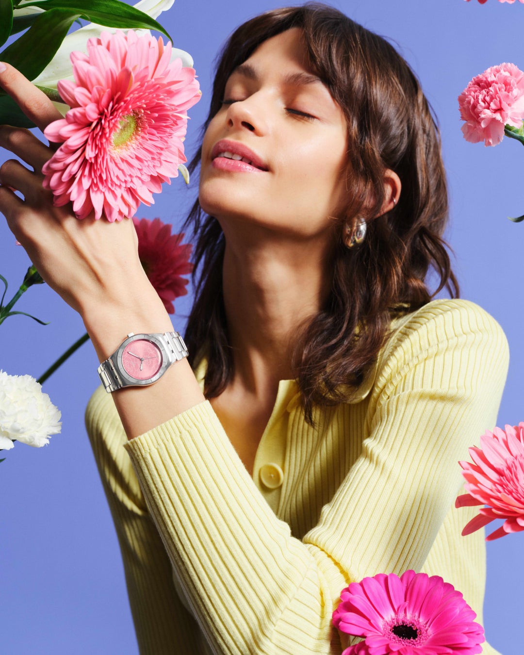 PETAL SWIRLのサニーイエローの文字盤には、ガーベラをイメージしたモチーフをエングレービングしました。このウォッチは、友情と幸福を象徴しており、どんな瞬間も、ポップな喜びと楽天的な雰囲気で満たします。