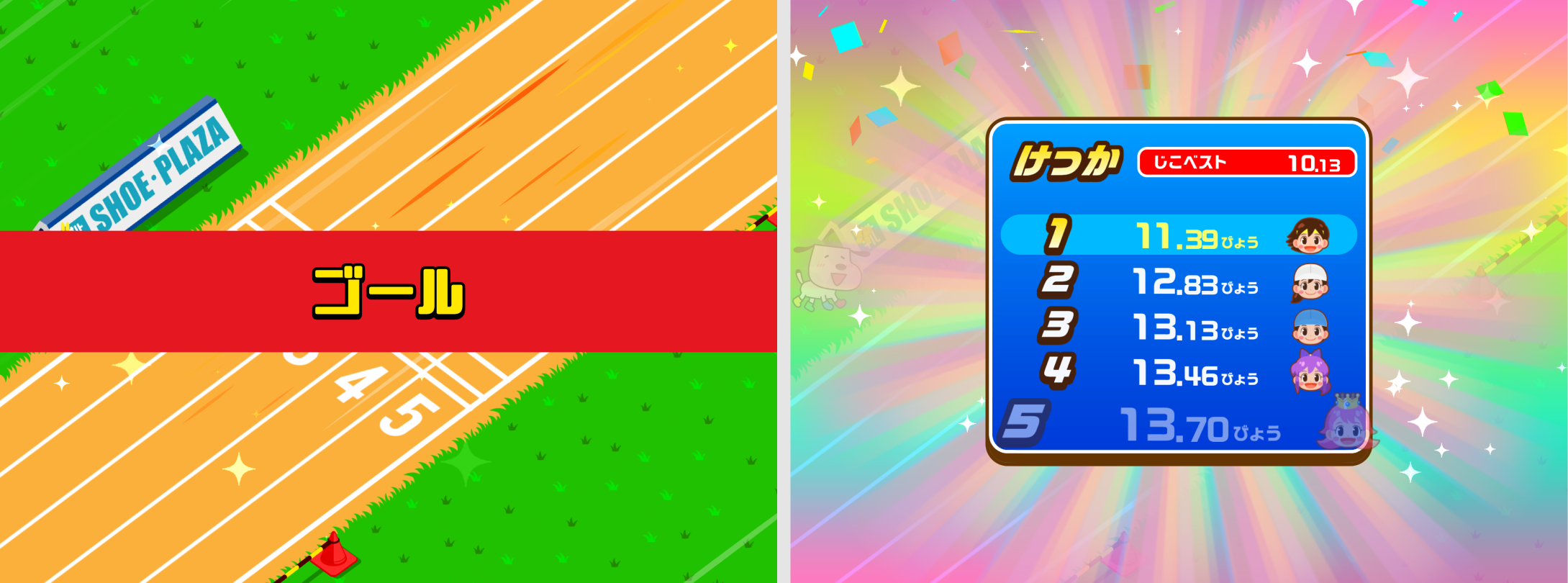かけっこをするキャラクターと靴を選択します。キャラクターによって走りの特性が変わります。