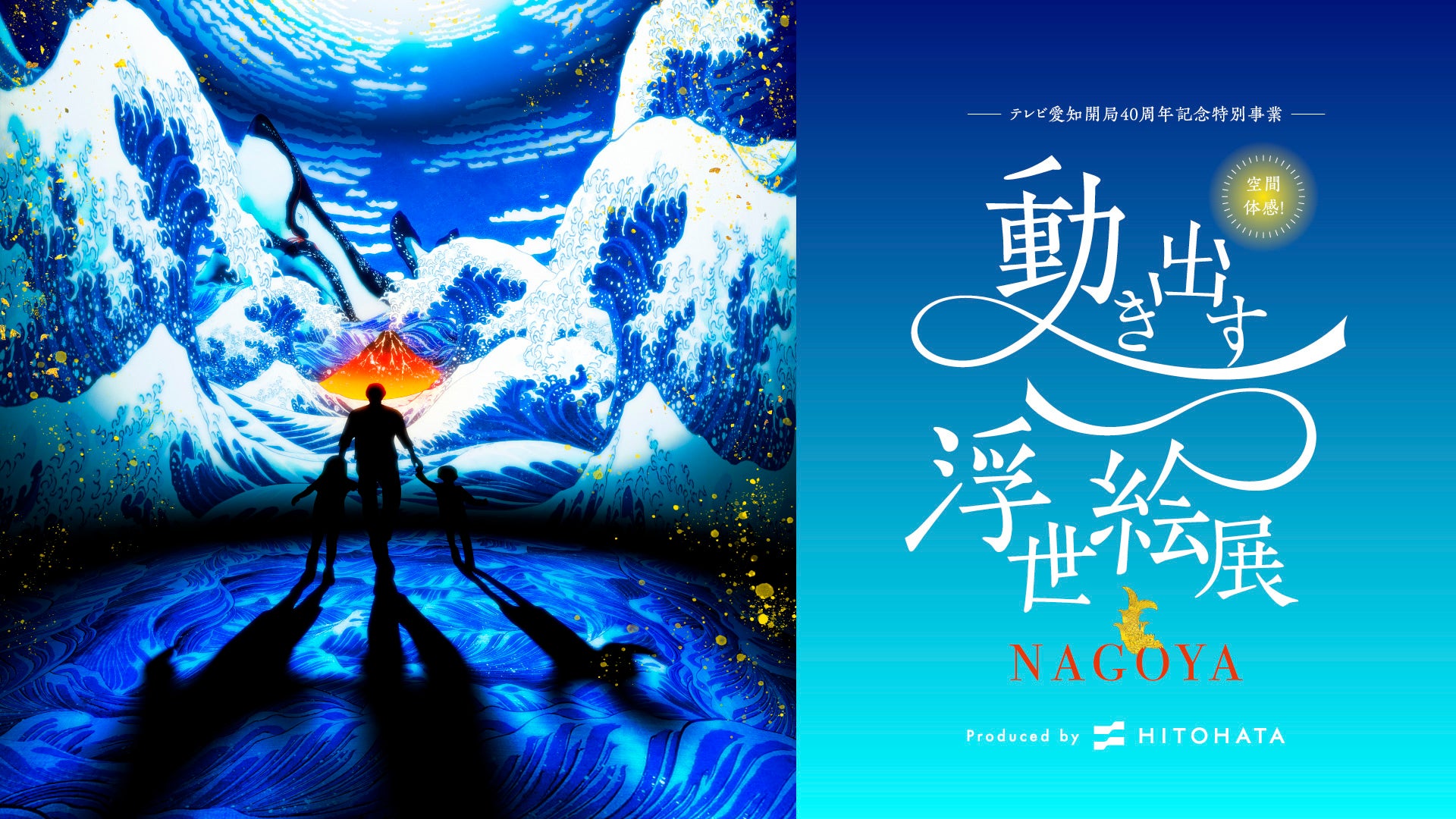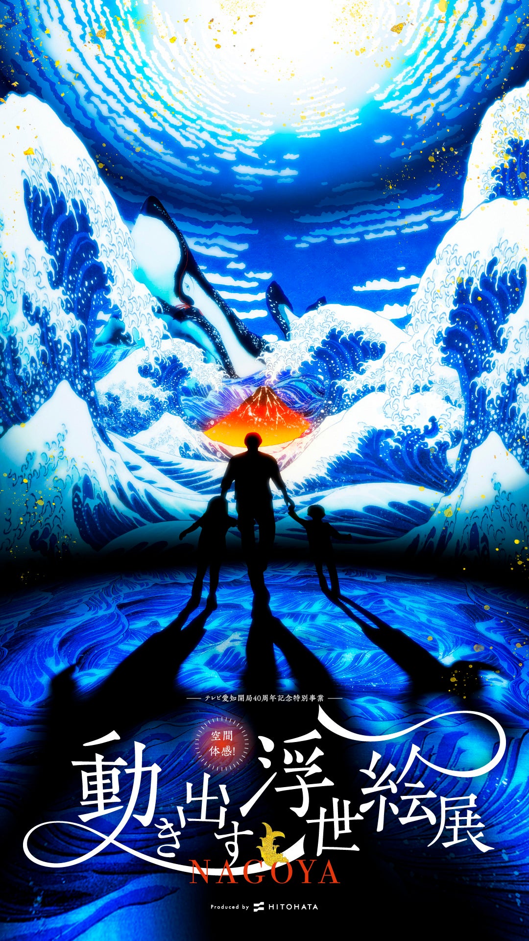 この催しは、テレビ愛知開局40周年記念特別事業として開催するもので、葛飾北斎、歌川国芳、歌川広重、喜多川歌麿、東洲斎写楽、歌川国貞など世界的な浮世絵師の作品300点以上をもとに、3DCGアニメーションやプロジェクションマッピングを駆使して大人から子どもまで楽しめるグラフィカルなデジタルアート作品として描き、6つの立体映像空間で浮世絵の世界に没入できる体感型デジタルアートミュージアムです。