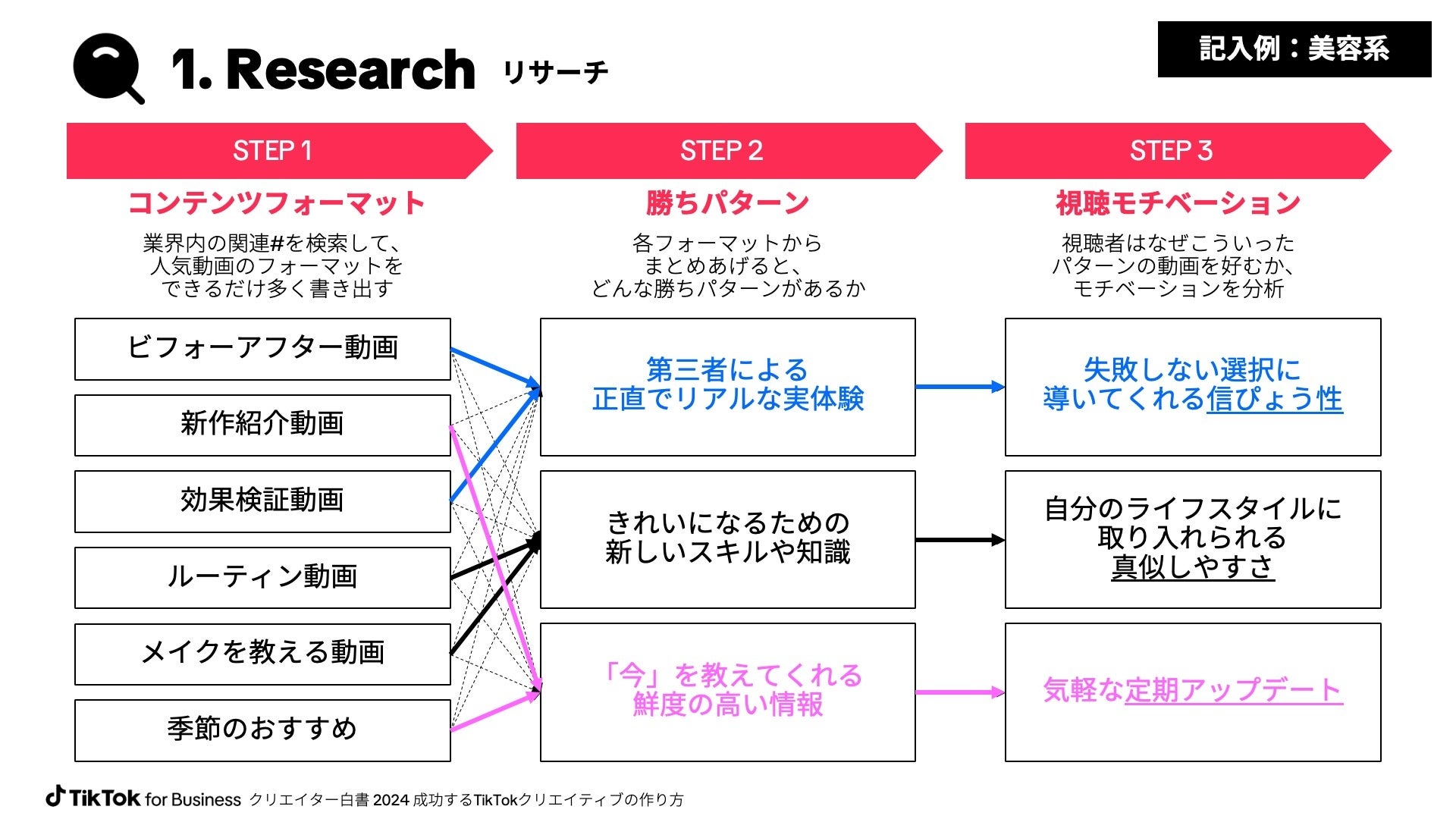 『1. Research / リサーチ』は、さらに3つのステップに分かれており、STEP.1では業界内の人気動画のコンテンツフォーマットをできるだけ多く書き出します。書き出したフォーマットから共通点を探し、“勝ちパターン”を見つけるのがSTEP.2、“勝ちパターン”の動画がなぜ好まれるのか、視聴者のモチベーションを分析するのがSTEP.3です。